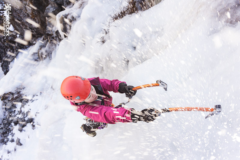 | From a distance Sickle on a Stick (WI5) looked pretty thin, but the pillar was in good condition. Jeanette snapped this photo of me dropping off a large chunk of ice on the lead. |